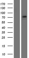 Western blot validation of overexpression lysate (Cat# LY405413) using anti-DDK antibody (Cat# TA50011-100). Left: Cell lysates from un-transfected HEK293T cells; Right: Cell lysates from HEK293T cells transfected with RC209870 using transfection reagent MegaTran 2.0 (Cat# TT210002).