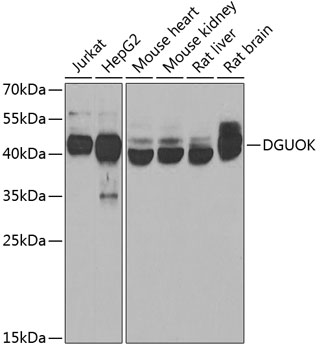 Western blot analysis of extracts of various cell lines using DGUOK Polyclonal Antibody at 1:1000 dilution.