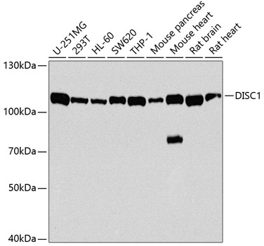 Western blot analysis of extracts of various cell lines using DISC1 Polyclonal Antibody at 1:1000 dilution.