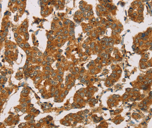 Immunohistochemistry of paraffin-embedded Human breast cancer tissue using DLL4 Polyclonal Antibody at dilution 1:50