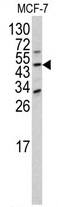 Western blot analysis of DOM3Z antibody (N-term Y88) in MCF-7 cell line lysates (35 ug/lane). DOM3Z (arrow) was detected using the purified Pab.