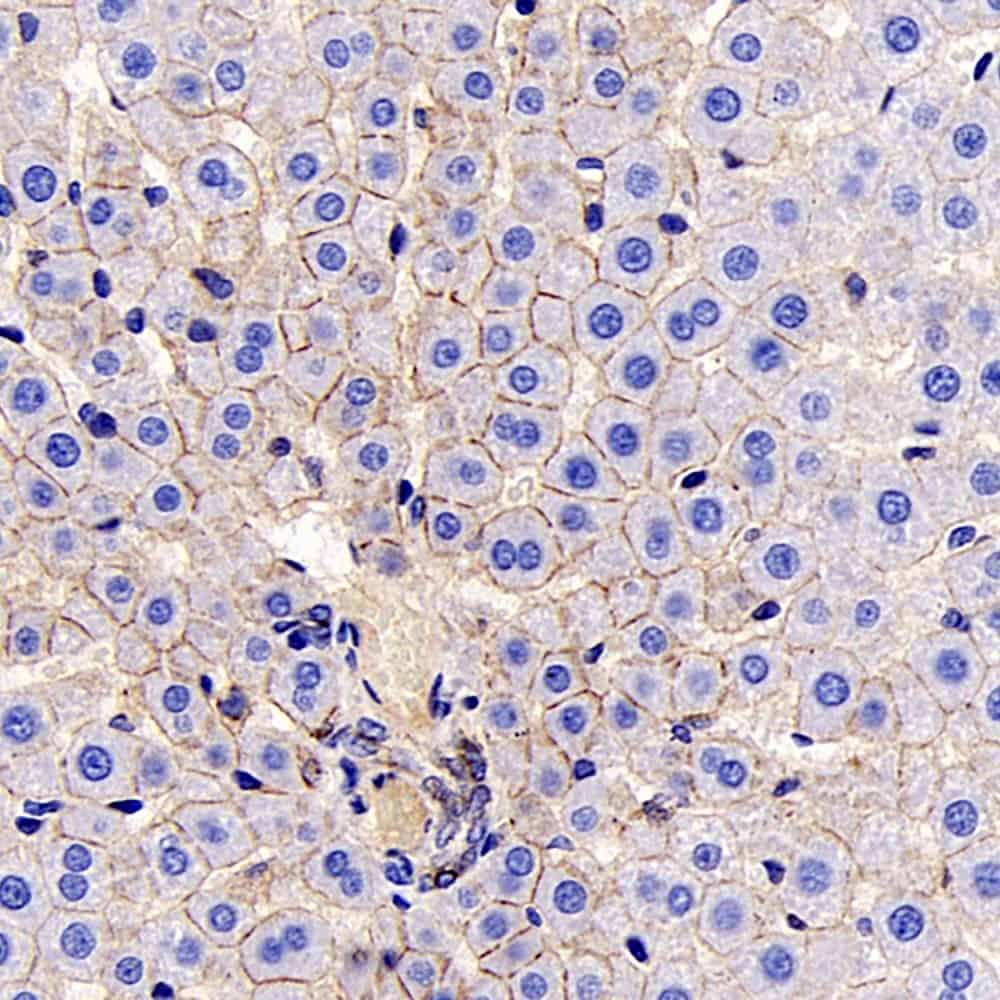 Immunohistochemistry analysis of paraffin-embedded mouse liver using E-Cadherin Monoclonal Antibody at dilution of 1:300.