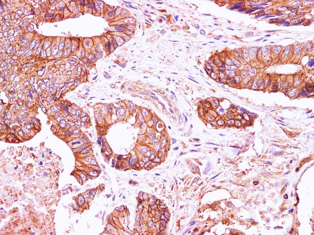 Immunohistochemistry of paraffin-embedded Human carcinoma of Colon using E-Cadherin Polyclonal Antibody at dilution of 1:100