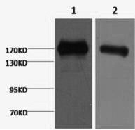 Western Blot analysis of 1) A431, 2) Hela cells using EGFR Monoclonal Antibody at dilution of 1:2000.