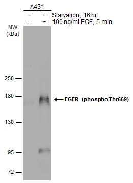 Untreated (–) and treated (+) A431 whole cell extracts (30 μg) were separated by 5% SDS-PAGE, and the membrane was blotted with EGFR (phospho Thr669) antibody (GTX133596) diluted at 1:2000. The HRP-conjugated anti-rabbit IgG antibody (GTX213110-01) was used to detect the primary antibody.