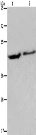 Western Blot analysis of Human adrenal pheochromocytoma and fetal brain tissue using EIF3H Polyclonal Antibody at dilution of 1:1150