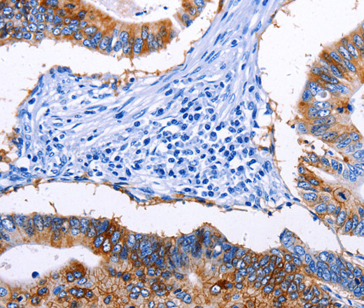 Immunohistochemistry of paraffin-embedded Human colon cancer tissue using EPCAM Polyclonal Antibody at dilution 1:45
