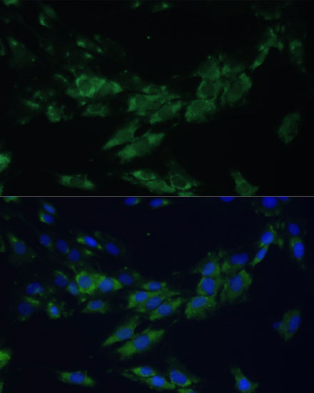 Immunofluorescence analysis of C6 cells using EPHA4 Polyclonal Antibody at dilution of 1:100. Blue: DAPI for nuclear staining.