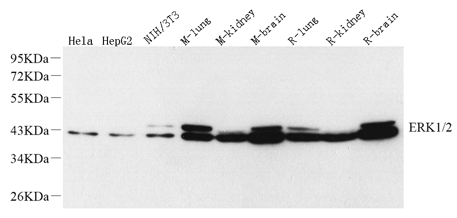 Western Blot analysis of various samples using ERK1/2 Monoclonal Antibody at dilution of 1:1000.