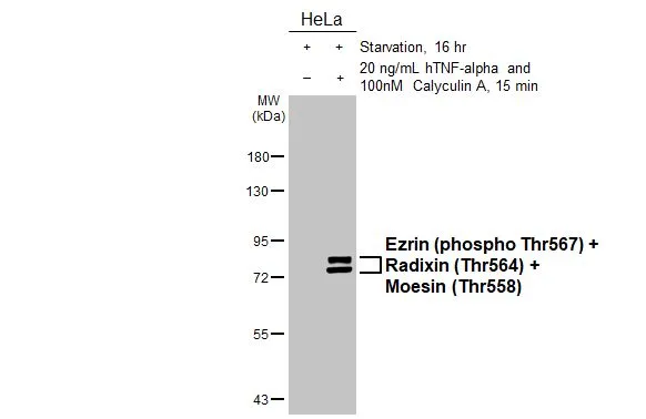 ![Untreated (–) and treated (+) HeLa whole cell extracts (30 μg) were separated by 7.5% SDS-PAGE, and the membrane was blotted with Ezrin (phospho Thr567) + Radixin (Thr564) + Moesin (Thr558) Antibody?[HL2909] (GTX640252) diluted at 1:1000. The HRP-conjugated anti-rabbit IgG antibody (GTX213110-01) was used to detect the primary antibody. Untreated (–) and treated (+) HeLa whole cell extracts (30 μg) were separated by 7.5% SDS-PAGE, and the membrane was blotted with Ezrin (phospho Thr567) + Radixin (Thr564) + Moesin (Thr558) Antibody?[HL2909] (GTX640252) diluted at 1:1000. The HRP-conjugated anti-rabbit IgG antibody (GTX213110-01) was used to detect the primary antibody.](https://www.genetex.com/upload/website/prouct_img/normal/GTX640252/GTX640252_T-45383_20250117_WB_treatment_hTNF-alpha_CalyculinA_25012200_379.webp)