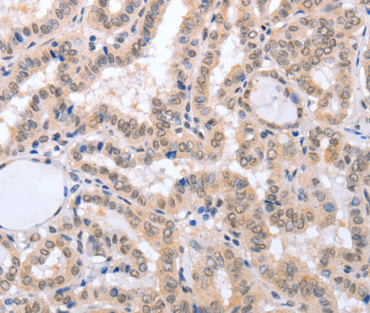 Immunohistochemistry of paraffin-embedded Human thyroid cancer tissue using FADD Polyclonal Antibody at dilution 1:50