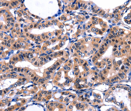 Immunohistochemistry of paraffin-embedded Human thyroid cancer tissue using FBN1 Polyclonal Antibody at dilution 1:47