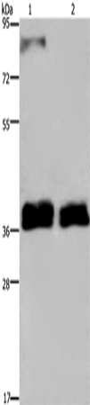 Western Blot analysis of 231 and A172 cell using FETUB Polyclonal Antibody at dilution of 1:700
