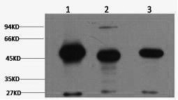 Western Blot analysis of 1) Mouse brain, 2) Rat brain using FH Monoclonal Antibody at dilution of 1:2000.