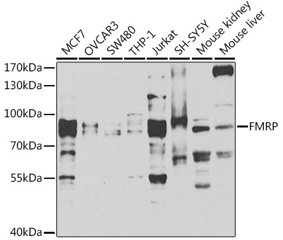 Western blot analysis of extracts of various cell lines using FMRP Polyclonal Antibody at 1:1000 dilution.