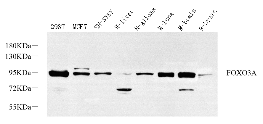 Western Blot analysis of various samples using FOXO3 Polyclonal Antibody at dilution of 1:1000.