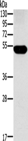 Western Blot analysis of Human placenta tissue using FUCA1 Polyclonal Antibody at dilution of 1:500