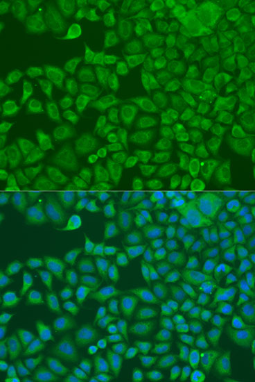 Immunofluorescence analysis of U2OS cells using FXR2 Polyclonal Antibody at dilution of 1:100. Blue: DAPI for nuclear staining.