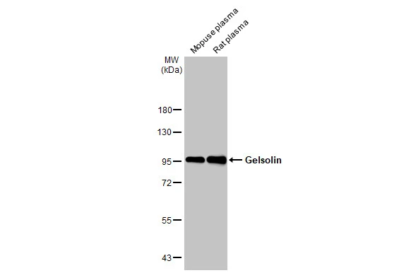 ![Mouse plasma and rat plasma (50 μg) were separated by 7.5% SDS-PAGE, and the membrane was blotted with Gelsolin antibody [HL1930] (GTX637767) diluted at 1:10000. The HRP-conjugated anti-rabbit IgG antibody (GTX213110-01) was used to detect the primary antibody. Mouse plasma and rat plasma (50 μg) were separated by 7.5% SDS-PAGE, and the membrane was blotted with Gelsolin antibody [HL1930] (GTX637767) diluted at 1:10000. The HRP-conjugated anti-rabbit IgG antibody (GTX213110-01) was used to detect the primary antibody.](https://www.genetex.com/upload/website/prouct_img/normal/GTX637767/GTX637767_T-44844_20221104_WB_M_R_22110919_520.webp)