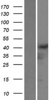 Western blot validation of overexpression lysate (Cat# LY405658) using anti-DDK antibody (Cat# TA50011-100). Left: Cell lysates from un-transfected HEK293T cells; Right: Cell lysates from HEK293T cells transfected with RC208808 using transfection reagent MegaTran 2.0 (Cat# TT210002).