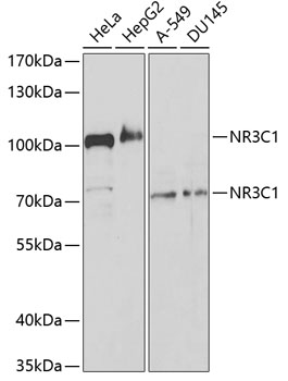 Western blot analysis of extracts of various cell lines using NR3C1 Polyclonal Antibody at dilution of 1:1000.