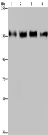 Western Blot analysis of 293T, Hela, A172 and A549 cell using GOLGA2 Polyclonal Antibody at dilution of 1:300