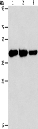 Western Blot analysis of Human normal liver tissue, Mouse brain and heart tissue using GOT1 Polyclonal Antibody at dilution of 1:1600