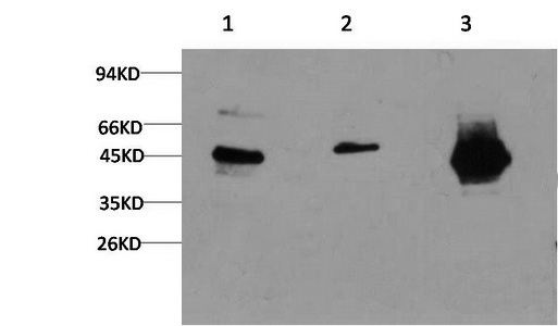 Western Blot analysis of 1) Hela, 2) 3T3, 3) Rat brain using GSK3 beta Monoclonal Antibody at dilution of 1:1000.