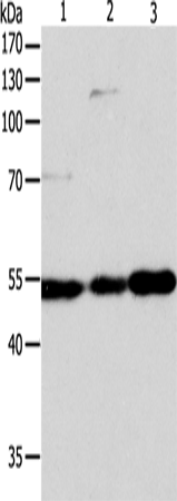 Western Blot analysis of Jurkat, Hela and A549 cell using GSR Polyclonal Antibody at dilution of 1:750