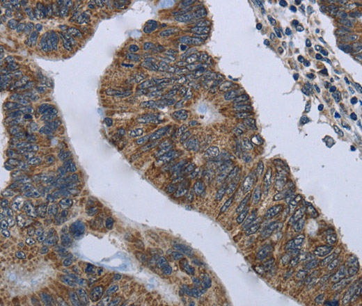 Immunohistochemistry of paraffin-embedded Human colon cancer tissue using CD236 Polyclonal Antibody at dilution 1:60