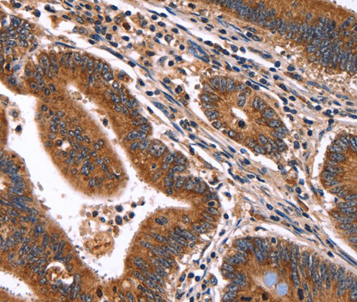 Immunohistochemistry of paraffin-embedded Human colon cancer tissue using HACE1 Polyclonal Antibody at dilution 1:50