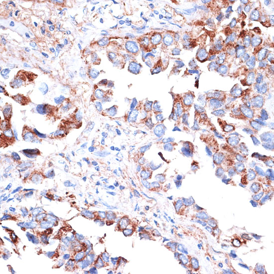 Immunohistochemistry of paraffin-embedded Human lung cancer using TIM-3/HAVCR2 Polyclonal Antibody at dilution of 1:200 (40x lens).