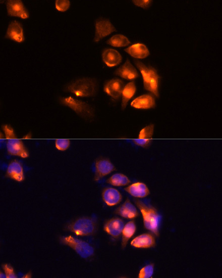 Immunofluorescence analysis of Hela cells using TIM-3/HAVCR2 Polyclonal Antibody at dilution of 1:100 (40x lens). Blue: DAPI for nuclear staining.