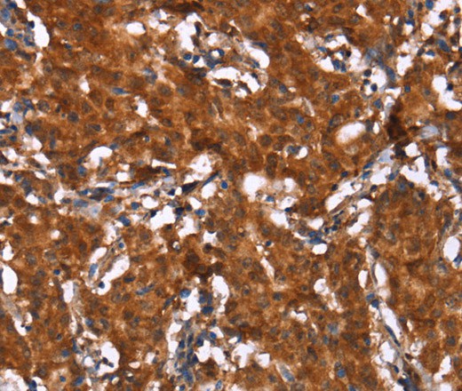 Immunohistochemistry of paraffin-embedded Human gasrtic cancer tissue using HCAR2 Polyclonal Antibody at dilution 1:40