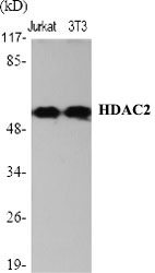 Western Blot analysis of Jurkat, 3T3 cells using HDAC2 Polyclonal Antibody at dilution of 1:2000.