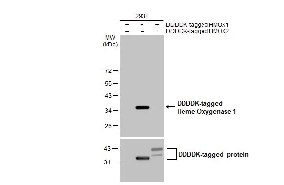 ![Non-transfected (–) and transfected (+) 293T whole cell extracts (30 μg) were separated by 12% SDS-PAGE, and the membrane was blotted with Heme Oxygenase 1 antibody [GT1334] (GTX633676) diluted at 1:5000. The HRP-conjugated anti-mouse IgG antibody (GTX213111-01) was used to detect the primary antibody. Non-transfected (–) and transfected (+) 293T whole cell extracts (30 μg) were separated by 12% SDS-PAGE, and the membrane was blotted with Heme Oxygenase 1 antibody [GT1334] (GTX633676) diluted at 1:5000. The HRP-conjugated anti-mouse IgG antibody (GTX213111-01) was used to detect the primary antibody.](https://www.genetex.com/upload/website/prouct_img/normal/GTX633676/GTX633676_42590_20230519_WB_multiple_B_23053001_657.webp)
