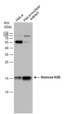 HeLa whole cell and nuclear extracts (30 μg) were separated by 15% SDS-PAGE, and the membrane was blotted with Histone H2B antibody (GTX129434) diluted at 1:1000.
