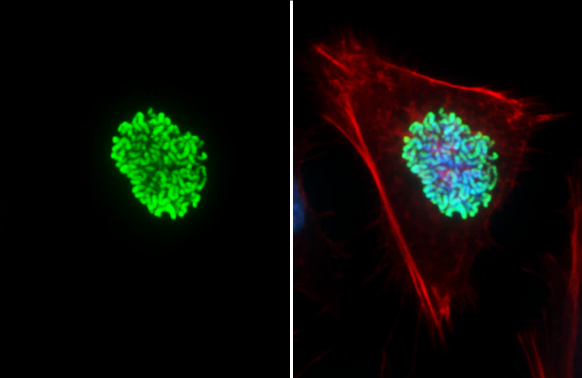 Histone H3 antibody detects Histone H3 protein by immunofluorescent analysis. Sample: HeLa cells were fixed in 4% paraformaldehyde at RT for 15 min. Green: Histone H3 stained by Histone H3 antibody (GTX130464) diluted at 1:2000. Red: phalloidin, a cytoskeleton marker, diluted at 1:100. Blue: Fluoroshield with DAPI (GTX30920).