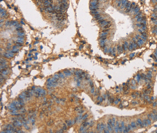 Immunohistochemistry of paraffin-embedded Human colon cancer tissue using HK3 Polyclonal Antibody at dilution 1:40