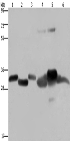 Western Blot analysis of Mouse thymus and Human ovarian cancer tissue, Mouse heart, Human fetal liver, Mouse liver tissue and SKOV3 cell using HMGCL Polyclonal Antibody at dilution of 1:300