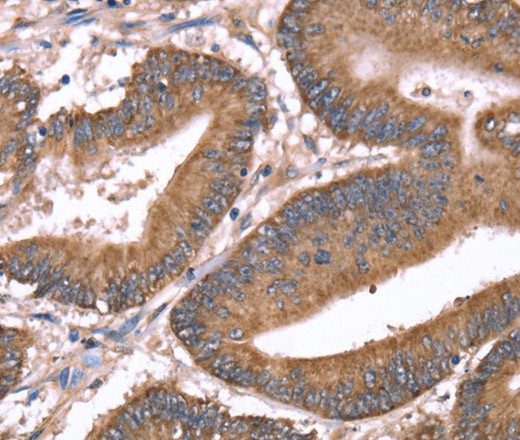 Immunohistochemistry of paraffin-embedded Human colon cancer tissue using HRG Polyclonal Antibody at dilution 1:50