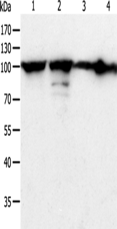 Western Blot analysis of Hela cell and Human liver cancer tissue, Jurkat and NIH/3T3 cell using HSP90B1 Polyclonal Antibody at dilution of 1:900