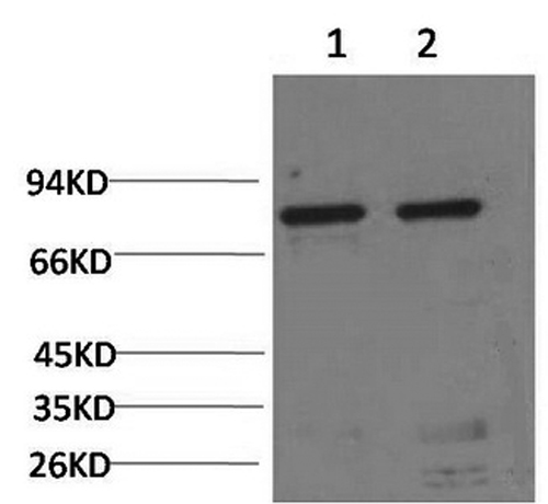 Western Blot analysis of 1) Hela, 2) Rat liver using HSPA5 Monoclonal Antibody at dilution of 1:2000.