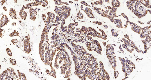 Immunohistochemistry analysis of paraffin-embedded human stomach cancer using HSPA5 Polyclonal Antibody at dilution of 1:300.