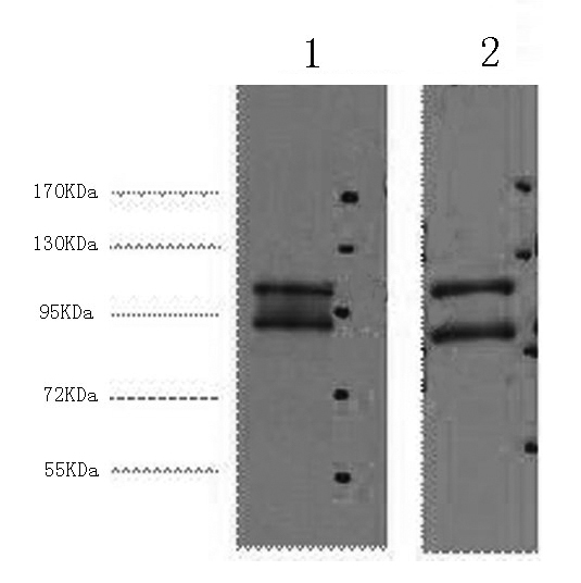 Western Blot analysis of 1) Hela, 2) HepG2 cells using IDE Monoclonal Antibody at dilution of 1:2000.
