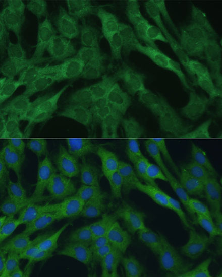 Immunofluorescence analysis of C6 cells using IDH1 Polyclonal Antibody at dilution of 1:100 (40x lens). Blue: DAPI for nuclear staining.