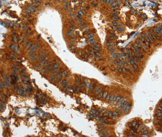 Immunohistochemistry of paraffin-embedded Human colon cancer tissue using IL20RA Polyclonal Antibody at dilution 1:35