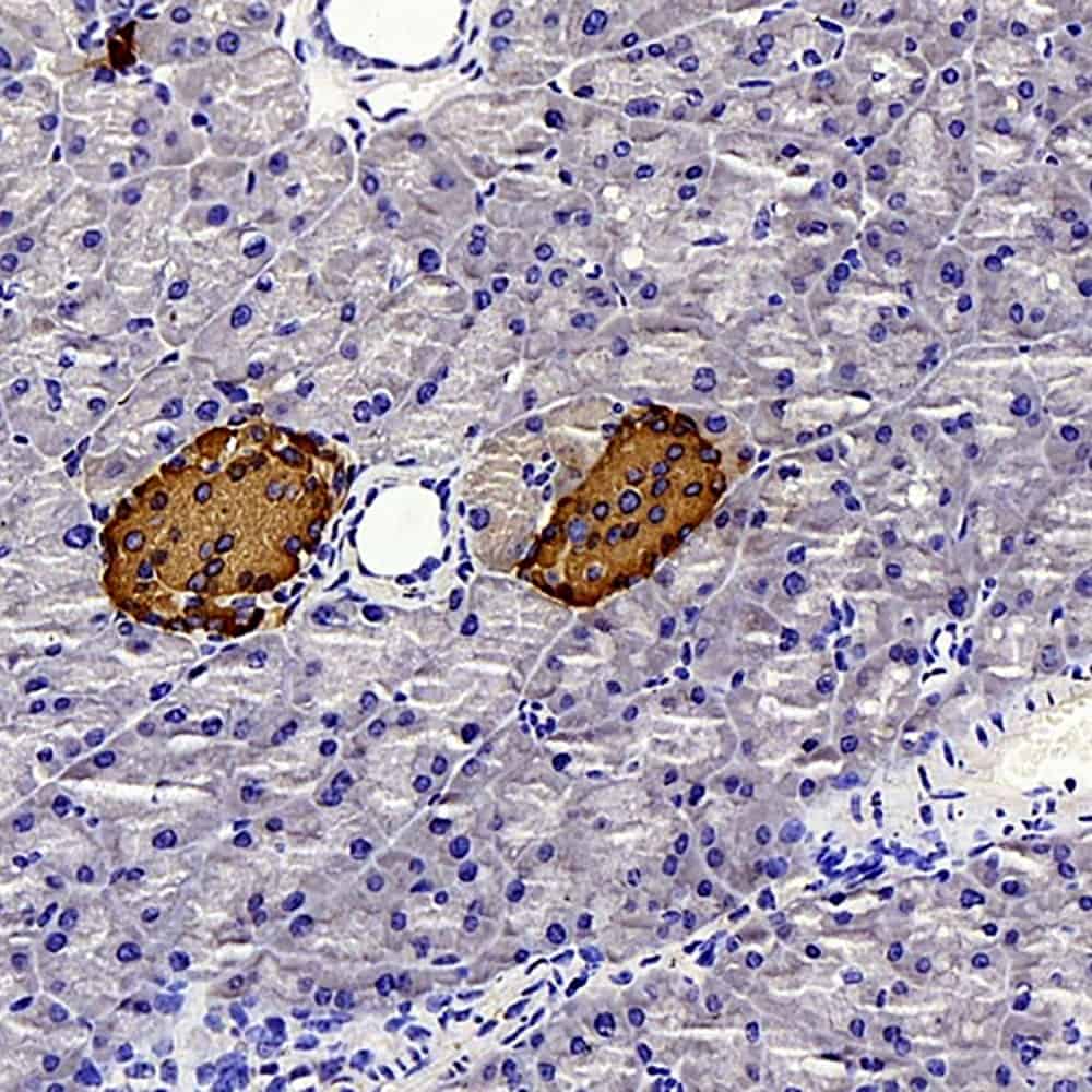 Immunohistochemistry analysis of paraffin-embedded mouse pancreas using Insulin Polyclonal Antibody at dilution of 1:300.