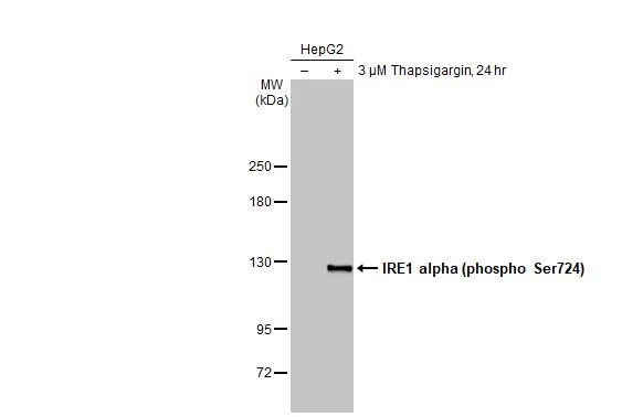 ![Untreated (–) and treated (+) HepG2 whole cell extracts (30 μg) were separated by 5% SDS-PAGE, and the membrane was blotted with IRE1 alpha (phospho Ser724) antibody [HL1885] (GTX637634) diluted at 1:1000. The HRP-conjugated anti-rabbit IgG antibody (GTX213110-01) was used to detect the primary antibody. Untreated (–) and treated (+) HepG2 whole cell extracts (30 μg) were separated by 5% SDS-PAGE, and the membrane was blotted with IRE1 alpha (phospho Ser724) antibody [HL1885] (GTX637634) diluted at 1:1000. The HRP-conjugated anti-rabbit IgG antibody (GTX213110-01) was used to detect the primary antibody.](https://www.genetex.com/upload/website/prouct_img/normal/GTX637634/GTX637634_44900_20230106_WB_treatment_Thapsigargin_23010922_646.webp)