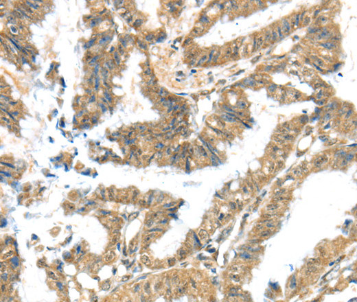 Immunohistochemistry of paraffin-embedded Human colon cancer tissue using KCNG3 Polyclonal Antibody at dilution 1:40